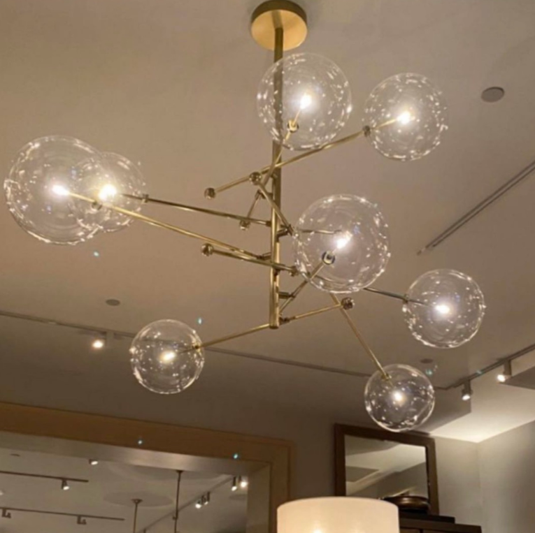 Люстра в корпусі метал кольору латунь на 6 або 8 прозорих плафонів з ріжками, що мають регулюючий механізм